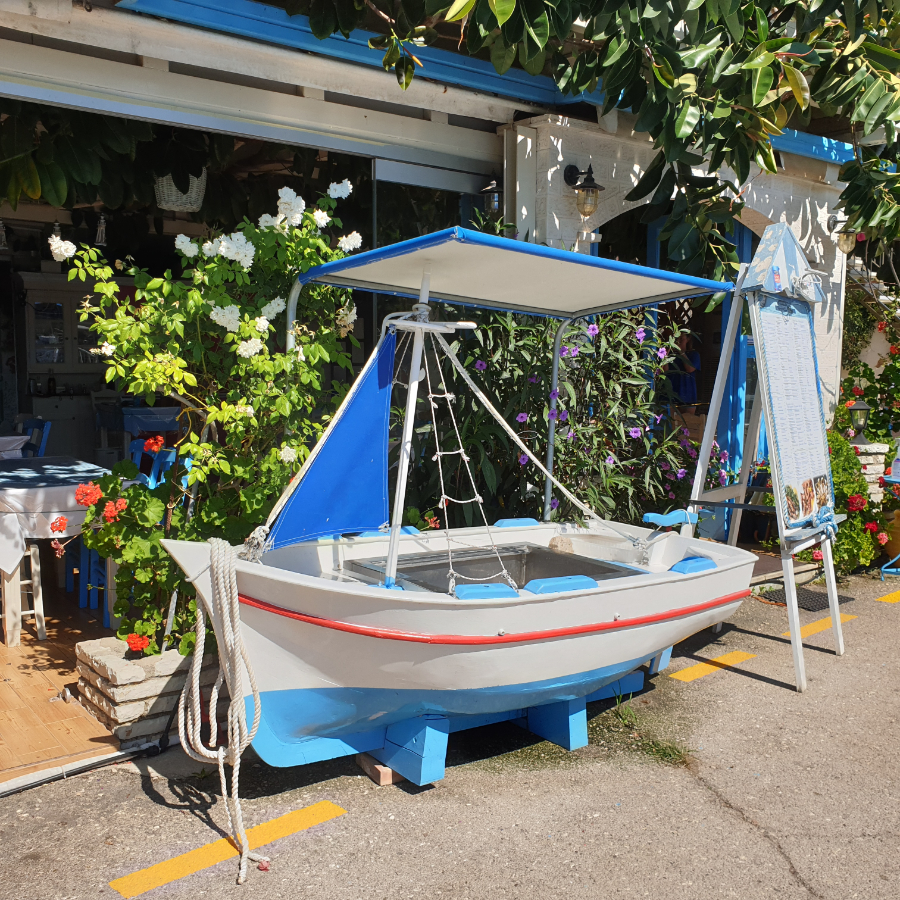 Na drie dagen op kleine, slaperige eilandjes is het tijd om weer een beetje leven op te zoeken. We varen naar Palaiokastritsa aan de westkust van Corfu: een prachtige baai met alle tinten turquoise water die je je voor kunt stellen. Hier gooien we het anker uit en vervolgens varen we met de dinghy naar de kant om een goed restaurant op te zoeken.
